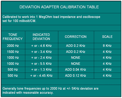 The scanner did not come with a schematic with the operator manual. I had to poke around the discriminator area of the scanner with a scope to find a suitable spot to extract non de-emphasized audio. I did find a suitable spot and tests indicated that it would be worth while to continue assembling the interface between the scanner and the scope. Also, indications were that the scanner's PLL phase noise was low. The scope I was to use to indicate deviation is calibrated in centimeters with a total of 8 centimeters full scale vertically. I decided to calibrate the interface box to indicate 0 to +/- 4 kHz deviation and 0 to +/- 8 kHz deviation. One centimeter of vertical deflection on the scope could be either indicate 1 or 2 kHz deviation using a toggle switch on the interface box to select between the two. A high quality oscilloscope should not be a requirement as we are only dealing with audio frequencies. An HF station monitor oscilloscope may be suitable or possibly a sound card scope but I have not tried this. Initially I used a commercial service monitor to calibrate the deviation monitor interface box but later used the Bessel zero method. Interestingly enough, the accuracy of this deviation monitor appears to be as good as some commercial units under the conditions hams would likely use it, that is setting repeater repeat deviation, checking CTCSS (PL) tones, adjusting for maximum deviation on VHF/UHF FM rigs etc. Where it falls off is with the combination of high deviation and high modulating frequencies. Here is a calibration table for this particular scanner created using the Bessel zero method for calibration.