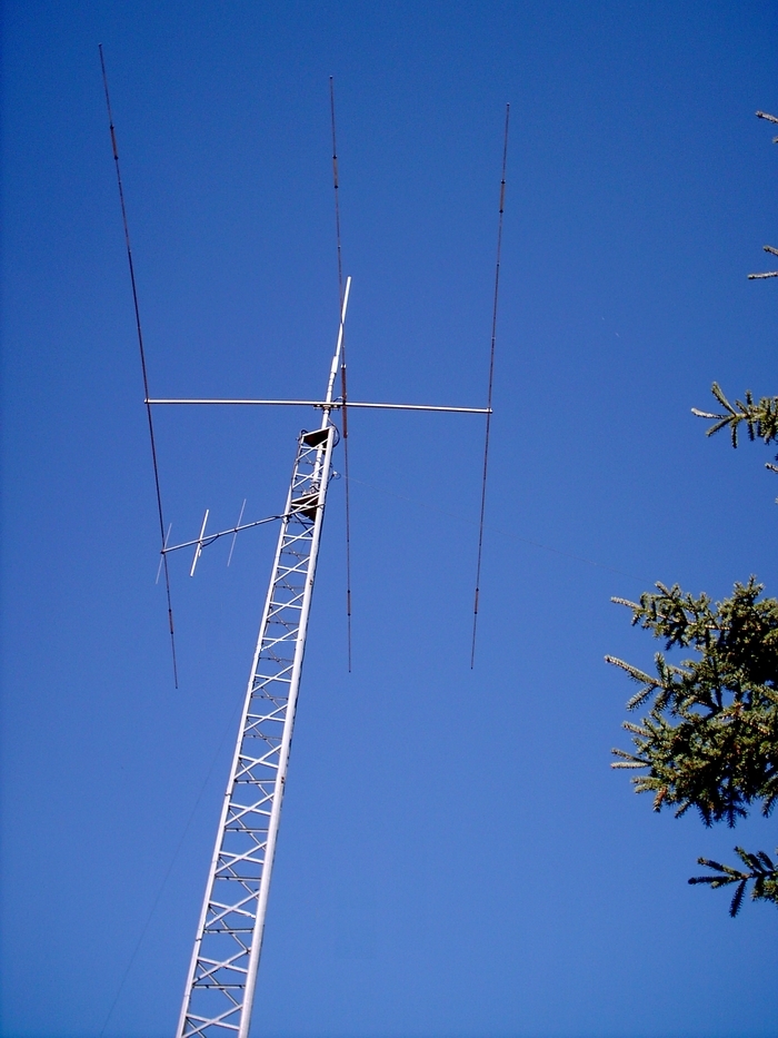 Starting from the top, the white PVC pipe is a homebrew 70 cm antenna for the VE6KQ repeater. It has a calculated gain of 4 dBd and is fed with 1/2" Andrews Heliax. Below that is a Mosley TA33jr 10-15-20 meter beam. This beam is not a big performer but has been very reliable. It was installed in 1978 and has never been down for repair. Barely visible is a 40 meter inverted V. The rotor is a Tailtwister. Below the rotor is a 3 element 2 meter beam made from Cushcraft parts. Not shown is a 6 meter dipole.